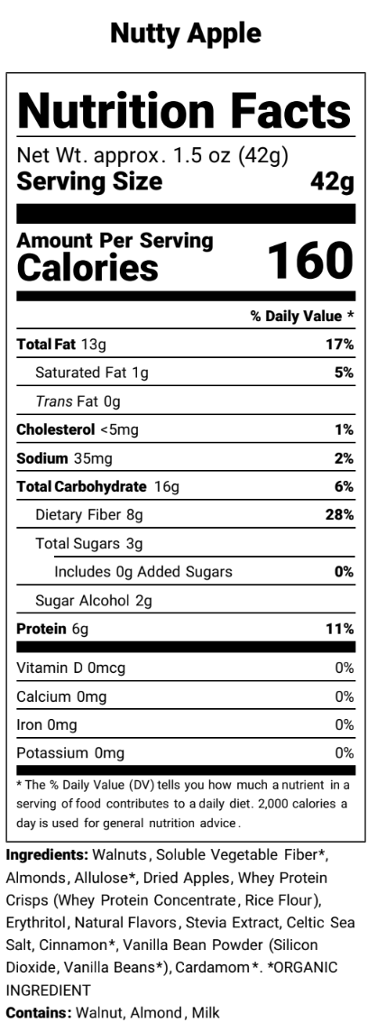 Walnuts, Soluble Vegetable Fiber*, Almonds, Allulose*, Dried Apples, Whey Protein Crisps (Whey Protein Concentrate, Rice Flour), Erythritol, Natural Flavors, Stevia Extract, Celtic Sea Salt, Cinnamon*, Vanilla Bean Powder (Silicon Dioxide, Vanilla Beans*), Cardamom*. *Organic Ingredient