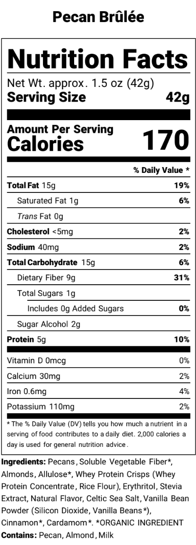 This bar layers the rich, nutty crunch of pecans with luscious vanilla bean and a dreamy crème brûlée-inspired sweetness. Finished with a kiss of sea salt and warming spices, it’s silky, crunchy, and sinfully satisfying without the sugar crash.